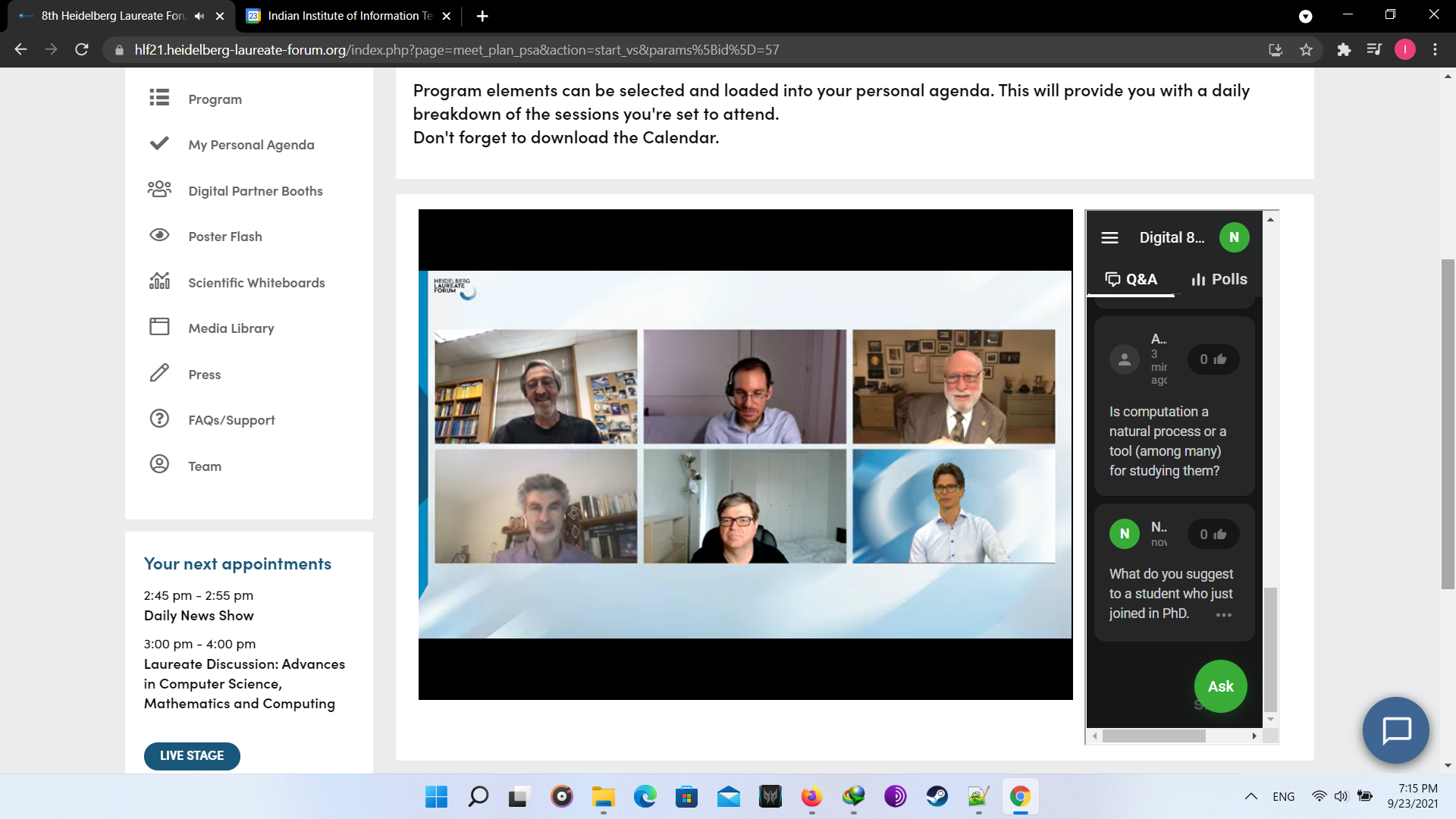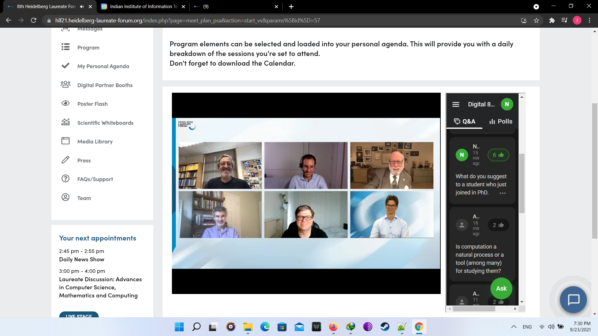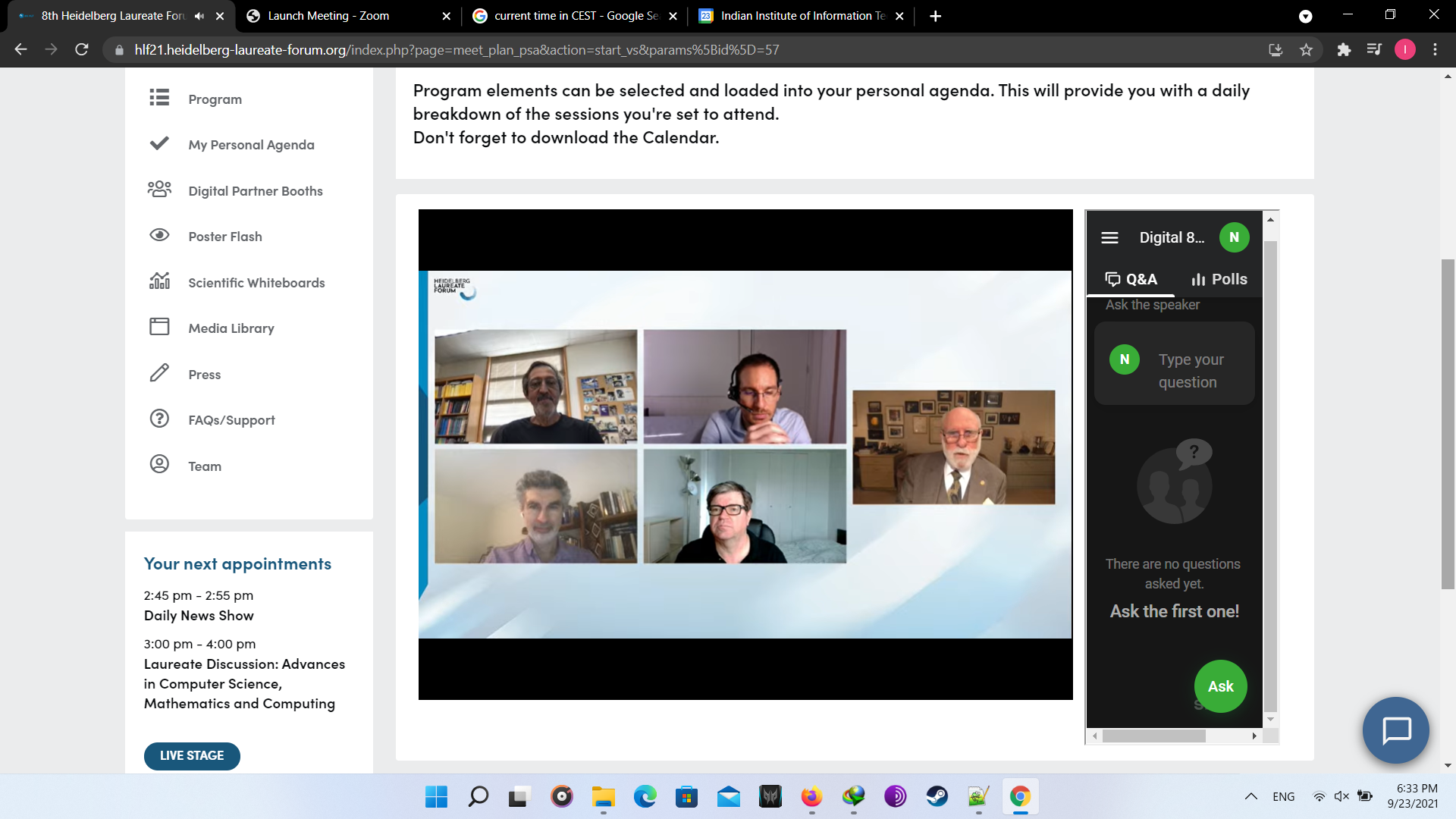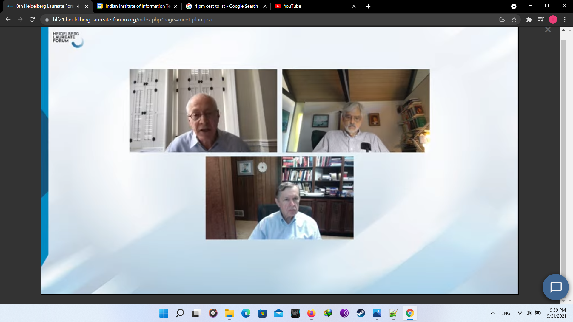 At first the opening ceremony was ceremony was conducted with beautiful songs. Though it was virtual but the feeling was real. In the lAt first, the opening ceremony was conducted with beautiful songs. Though it was virtual, however, the feeling was real. In the later session, lectures were conducted from great laureates. Later, there was another fun activity known as “Speed Networking”, in which I met with other participants randomly to connect for a limited time of 3 minutes. In the later session, I interacted with great laureate Prof. Leslie G. Valiant. Following this, I attended fishbowl session and panel discussions. At last, all participants interacted with each other in the virtual HLF environment. Day 1 was just the beginning of the fun. Below are the couple of images I took of day 1. Finally we end with the recap session providing describing experience the day.
