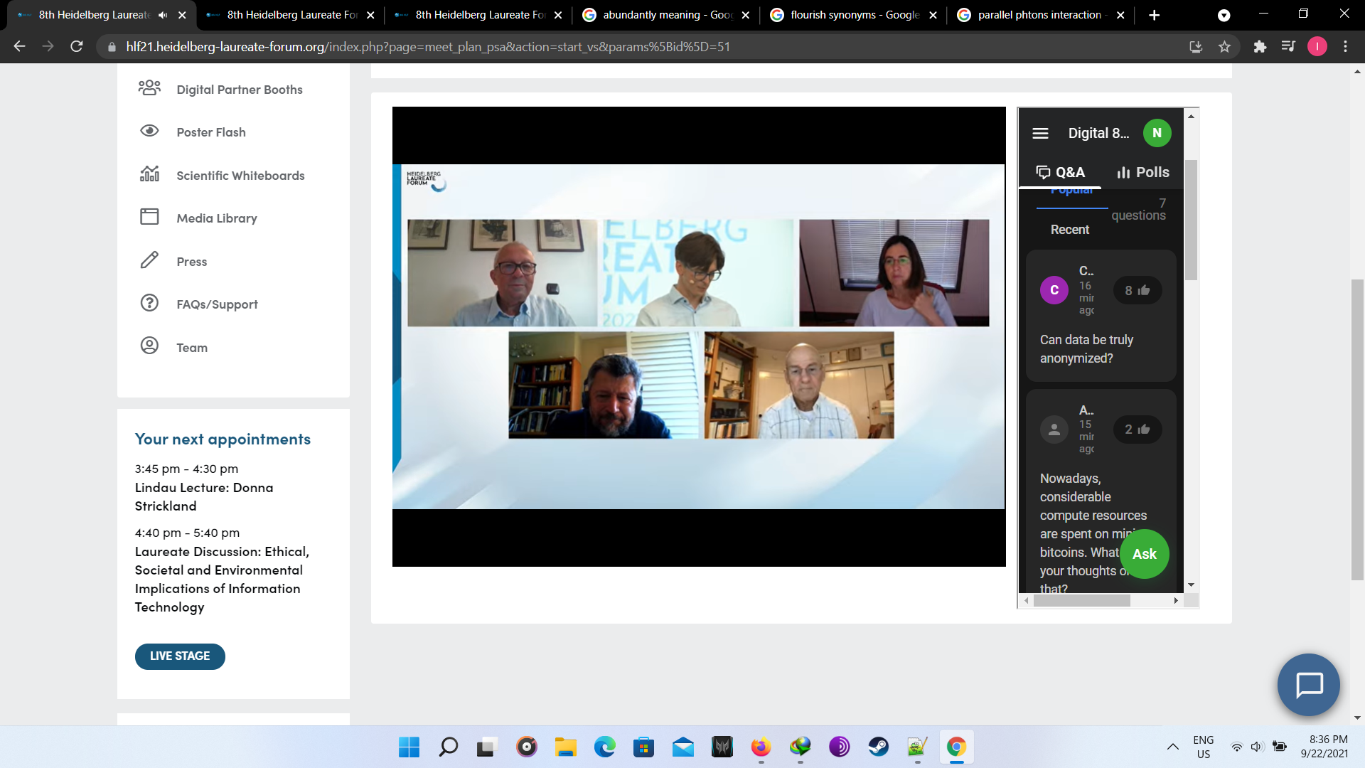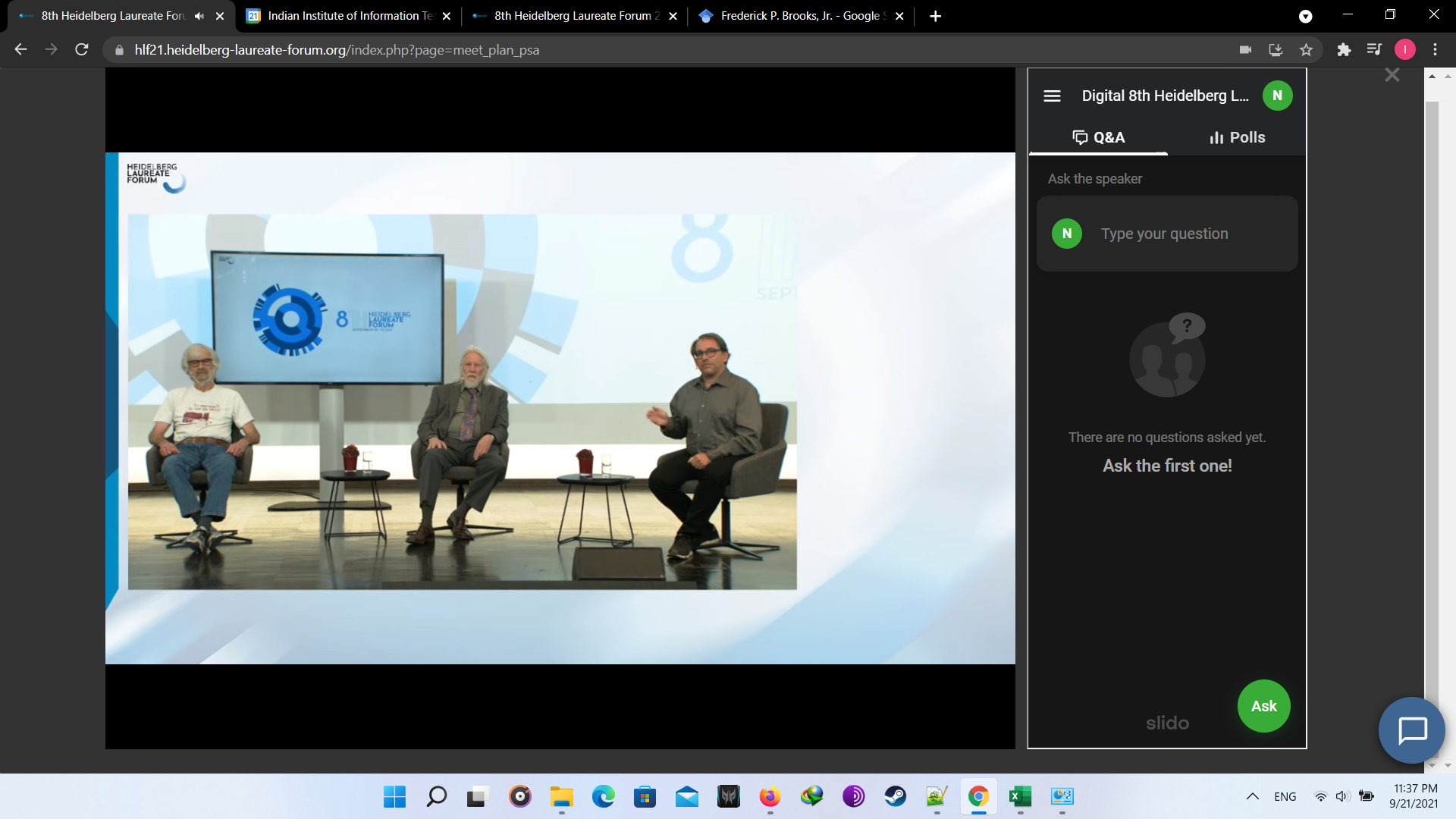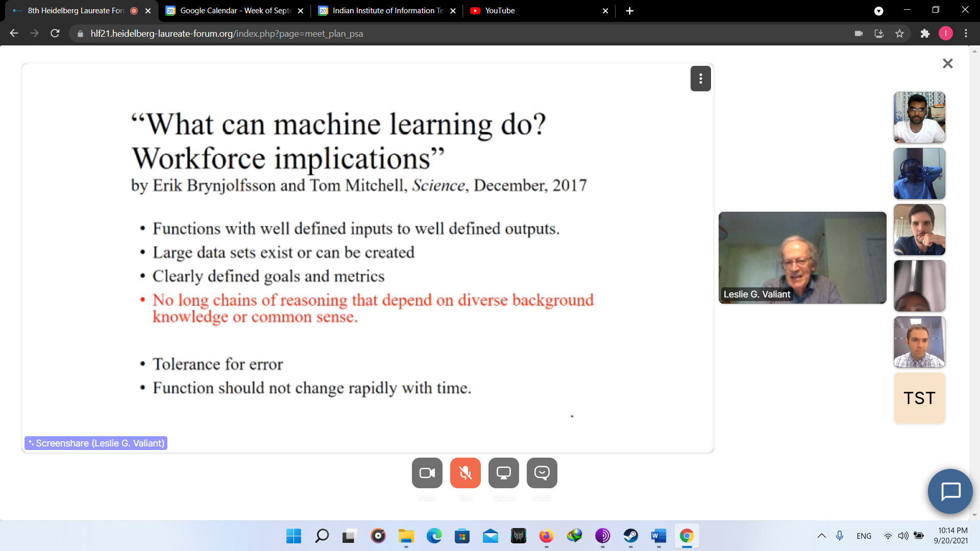 At first the opening ceremony was ceremony was conducted with beautiful songs. Though it was virtual but the feeling was real. In the lAt first, the opening ceremony was conducted with beautiful songs. Though it was virtual, however, the feeling was real. In the later session, lectures were conducted from great laureates. Later, there was another fun activity known as “Speed Networking”, in which I met with other participants randomly to connect for a limited time of 3 minutes. In the later session, I interacted with great laureate Prof. Leslie G. Valiant. Following this, I attended fishbowl session and panel discussions. At last, all participants interacted with each other in the virtual HLF environment. Day 1 was just the beginning of the fun. Below are the couple of images I took of day 1. Finally we end with the recap session providing describing experience the day.