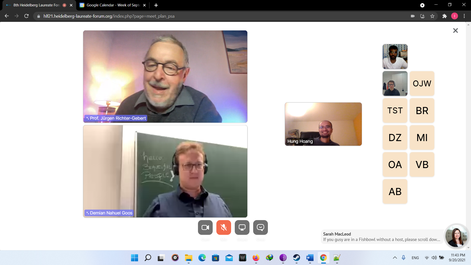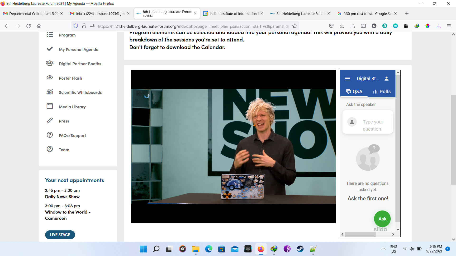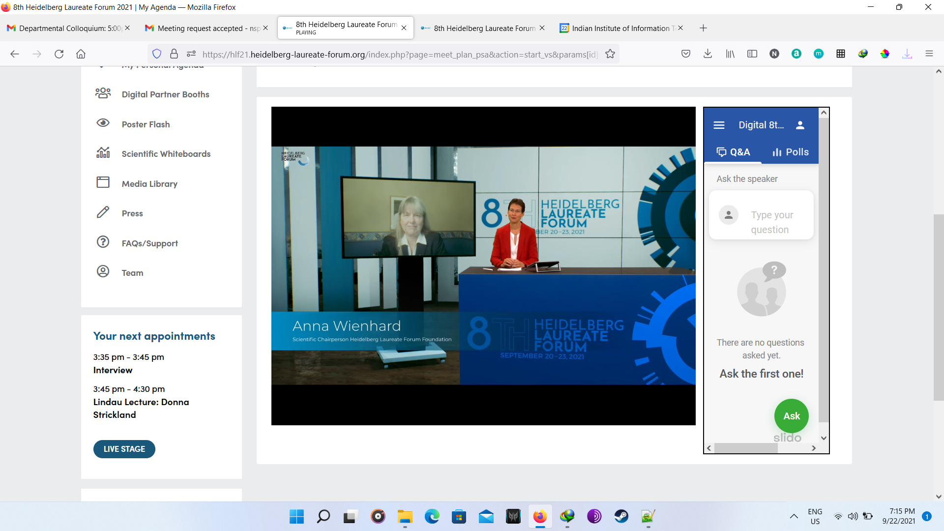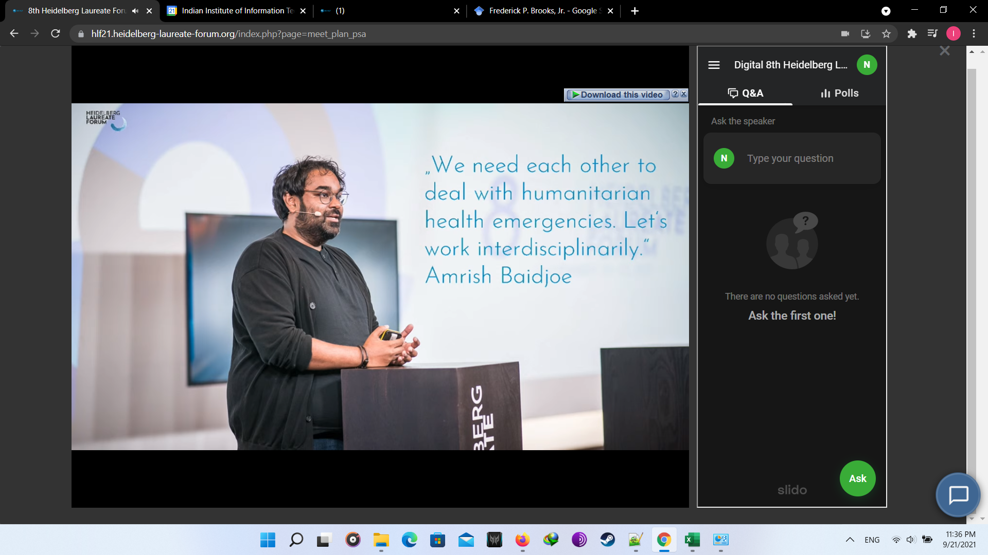 At first the opening ceremony was ceremony was conducted with beautiful songs. Though it was virtual but the feeling was real. In the lAt first, the opening ceremony was conducted with beautiful songs. Though it was virtual, however, the feeling was real. In the later session, lectures were conducted from great laureates. Later, there was another fun activity known as “Speed Networking”, in which I met with other participants randomly to connect for a limited time of 3 minutes. In the later session, I interacted with great laureate Prof. Leslie G. Valiant. Following this, I attended fishbowl session and panel discussions. At last, all participants interacted with each other in the virtual HLF environment. Day 1 was just the beginning of the fun. Below are the couple of images I took of day 1. Finally we end with the recap session providing describing experience the day.