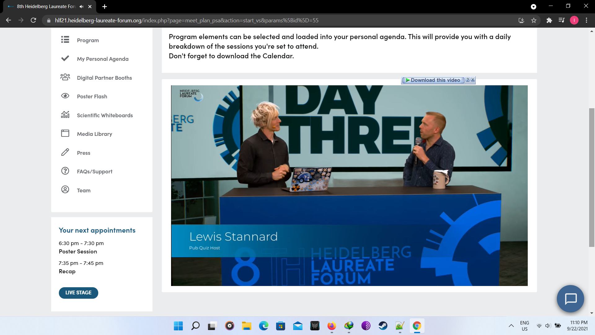 Again we start with the daily news event describing today’s events: world tour, laureates group discussion, poster sessions and pub quiz.