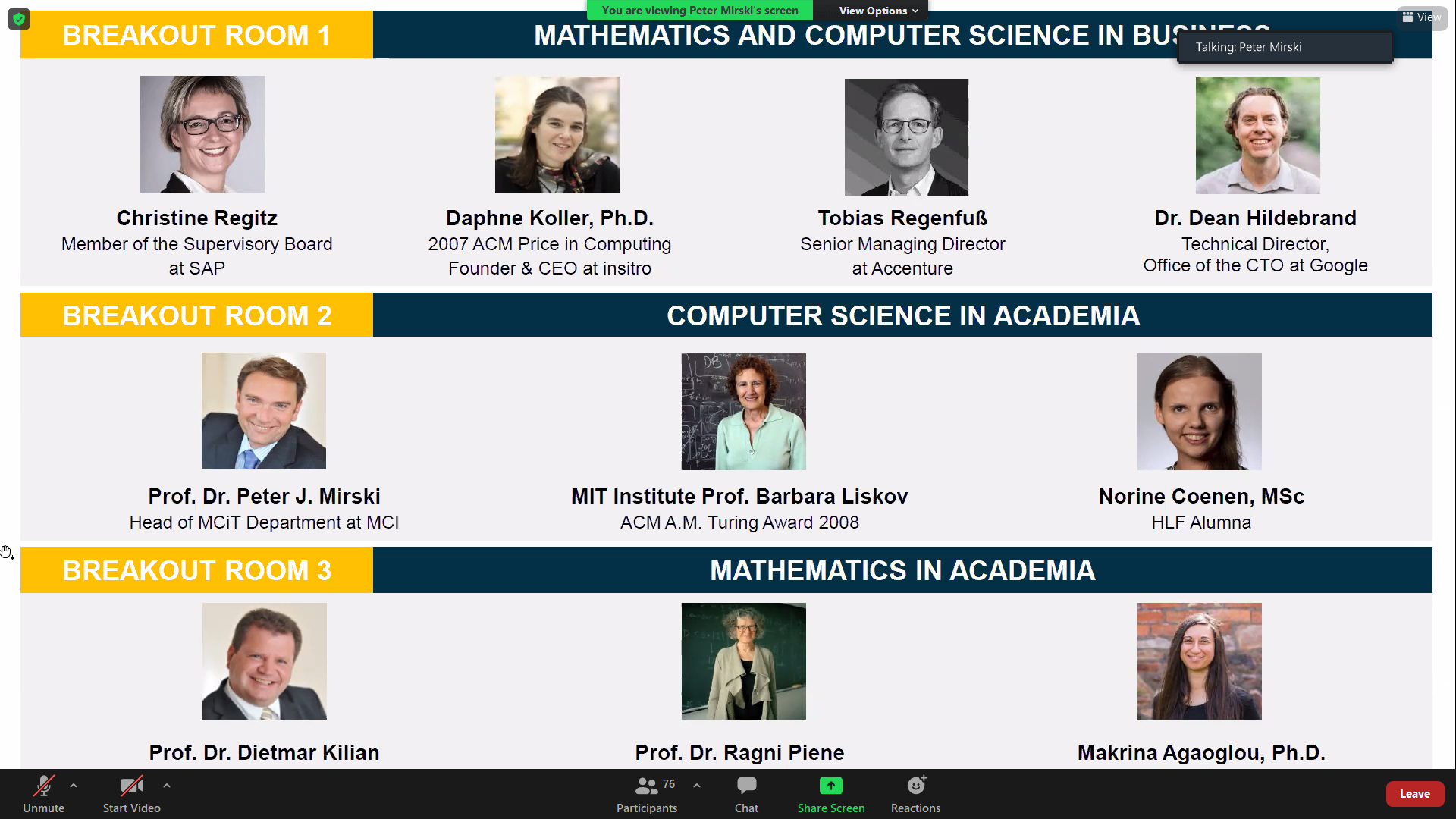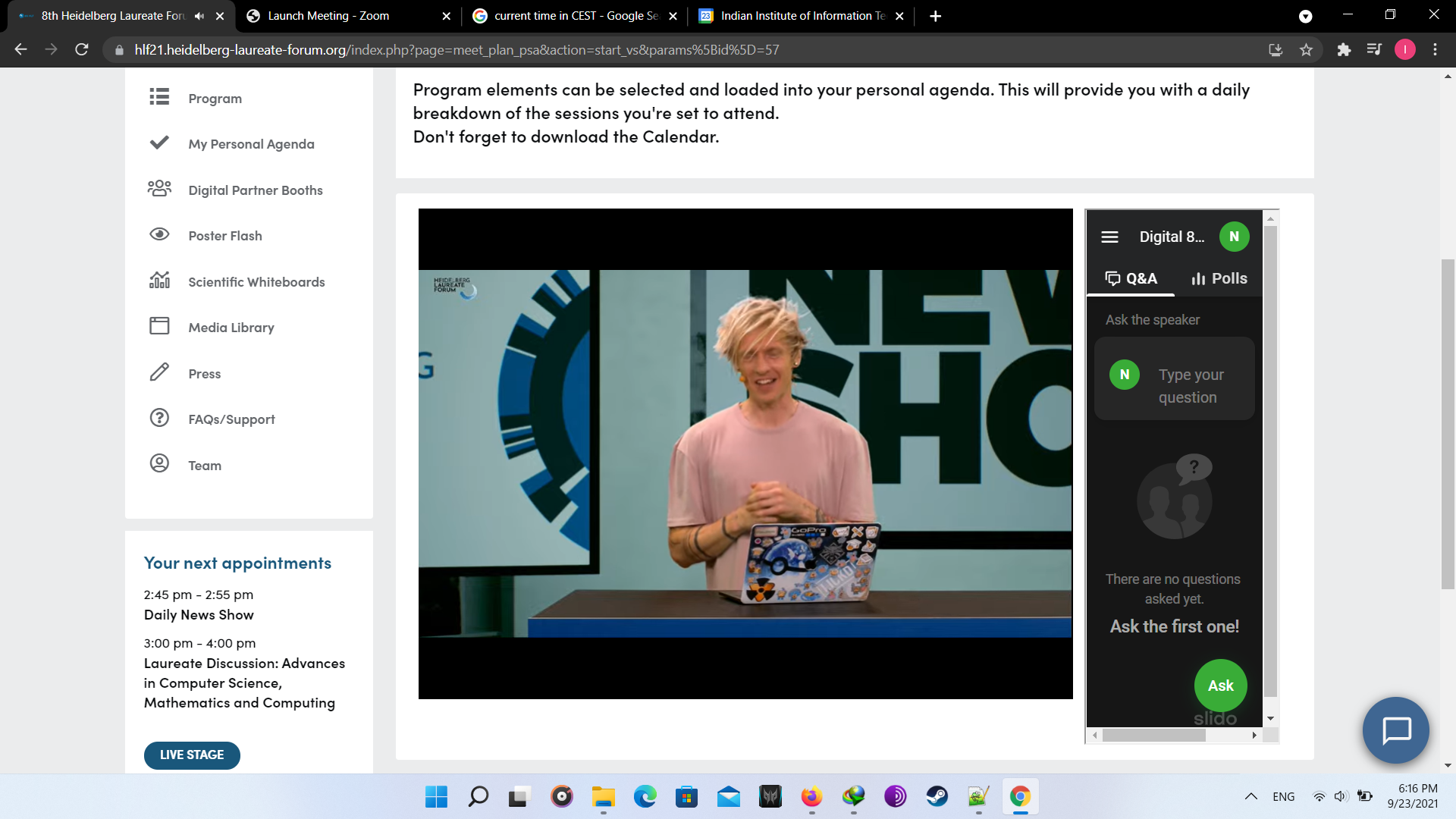 We again start with the daily news session: Laureate discussion, short interview, an interactive session as career path in both academic and business, closing ceremony and an after party