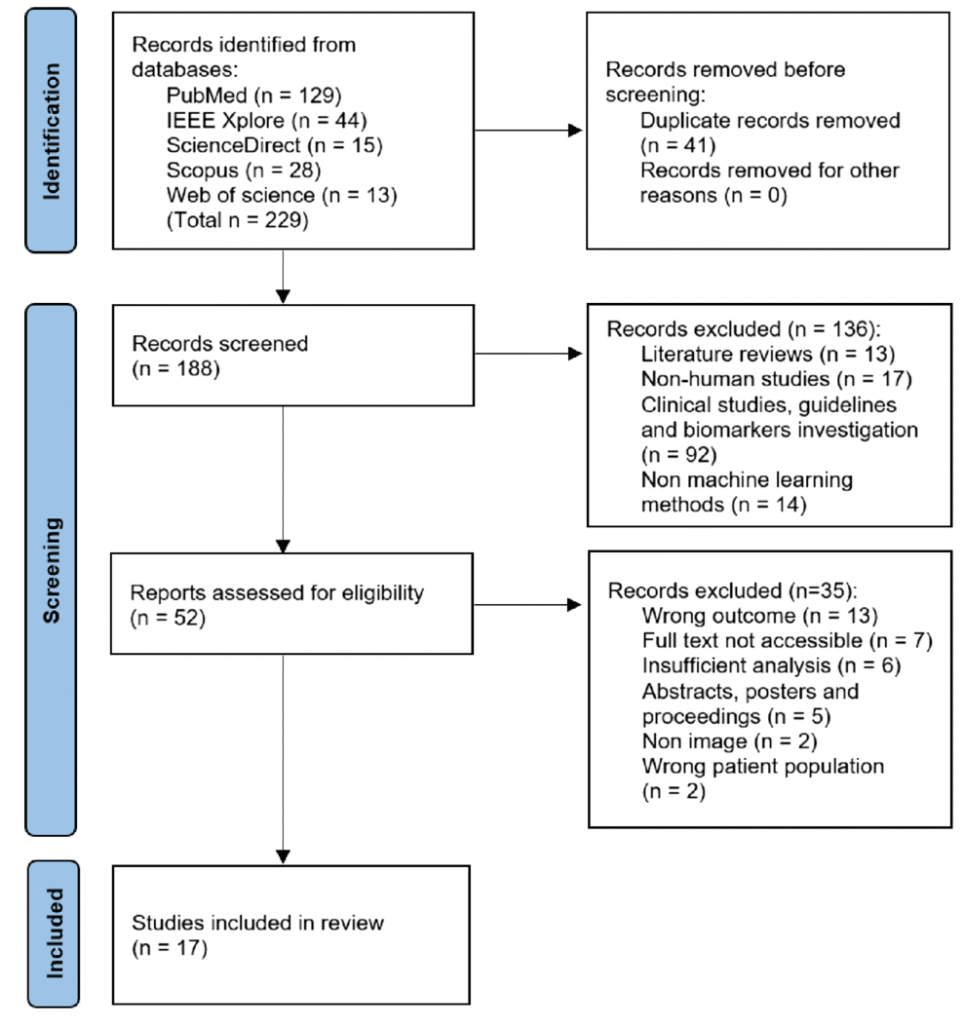 Results Among the 188 screened studies, 17 studies are selected. The methods are categorized as off-the-shelf (OTS), attention, generative, and ensemble classifiers. Most studies used OTS classifiers that combined pre-trained ML/DL methods with radiomics features to determine fibrosis staging. Although machine learning shows potential for fibrosis classification, there are limited external comparisons of interventions and prospective clinical trials, which limits their applicability.